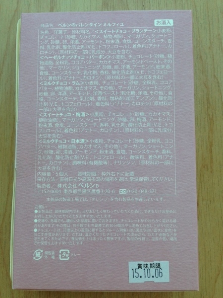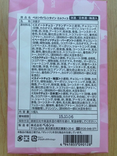 原材料:小麦粉、チョコレート(砂糖、カカオマス、植物油脂)、マーガリン、ショートニング、砂糖、卵、梅酒、アーモンド、粉末酒、食塩、コンスターチ、香料、乳化剤、酸化防止剤(V.E、トコフェロール)、着色料(アナトー、カロチン)(原材料の一部に乳成分、大豆を含む)
