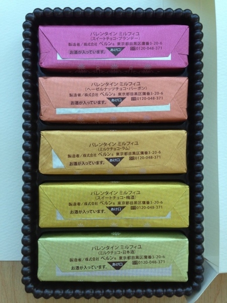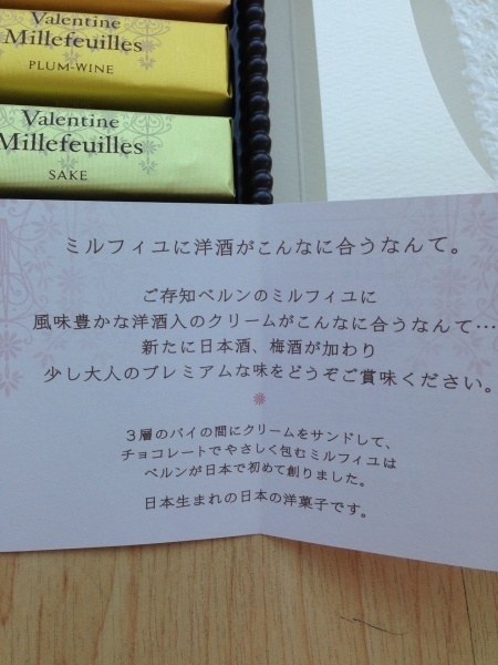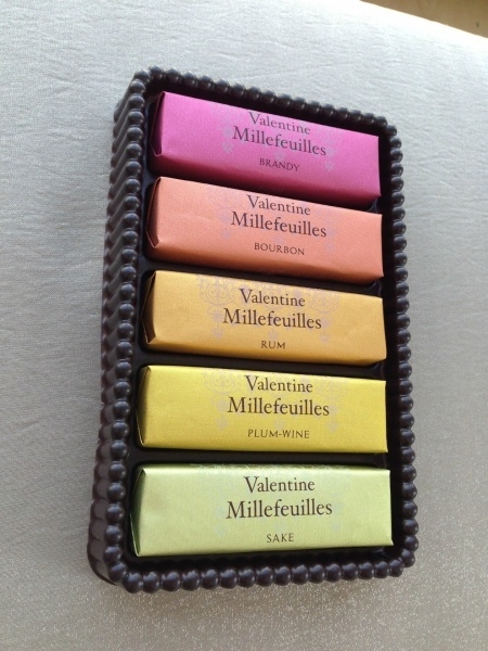 バレンタインのバージョンのベルンのミルフィーユは、お酒が入っているのが特長です。お酒の種類は、日本酒、梅酒、ラム酒、バーボン、ブランデーの5種類です。