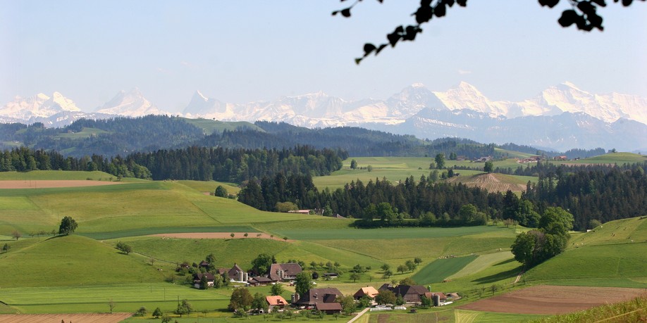 ここはベルンの東に広がる丘陵地帯、『穴あきチーズ』の里として有名なエンメンタール地方で、長閑な牧草地が広がっています。